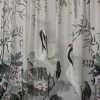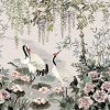 MIZU GARDEN FABRIC PANEL - Mizu Garden is a serene hand painted oasis inspired by Japanese watercolor paintings and features two red crowned cranes, which in Asian culture are a symbol of luck and longevity. The cranes are elegantly wading within the Mizu water garden, which features floral motifs referencing waterlilies from Lotus and peonies and wisteria flowers from our previous prints, Peonia and Papillon. The name Mizu derives from the Japanese word for water. The palette is nuanced, anchored in mineral green foliage, accented with feminine floral motifs, expertly hand painted in shades of pinks, reds and purple. Mizu Garden has been printed continuously onto a soft 100% linen base cloth, creating a semi translucent, atmospheric watercolor print.